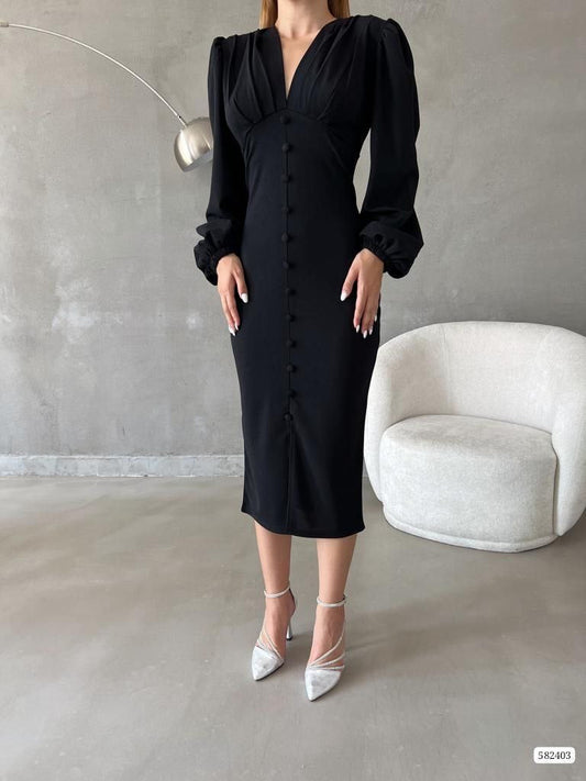 Robe boutonnée manches bouffantes - noir